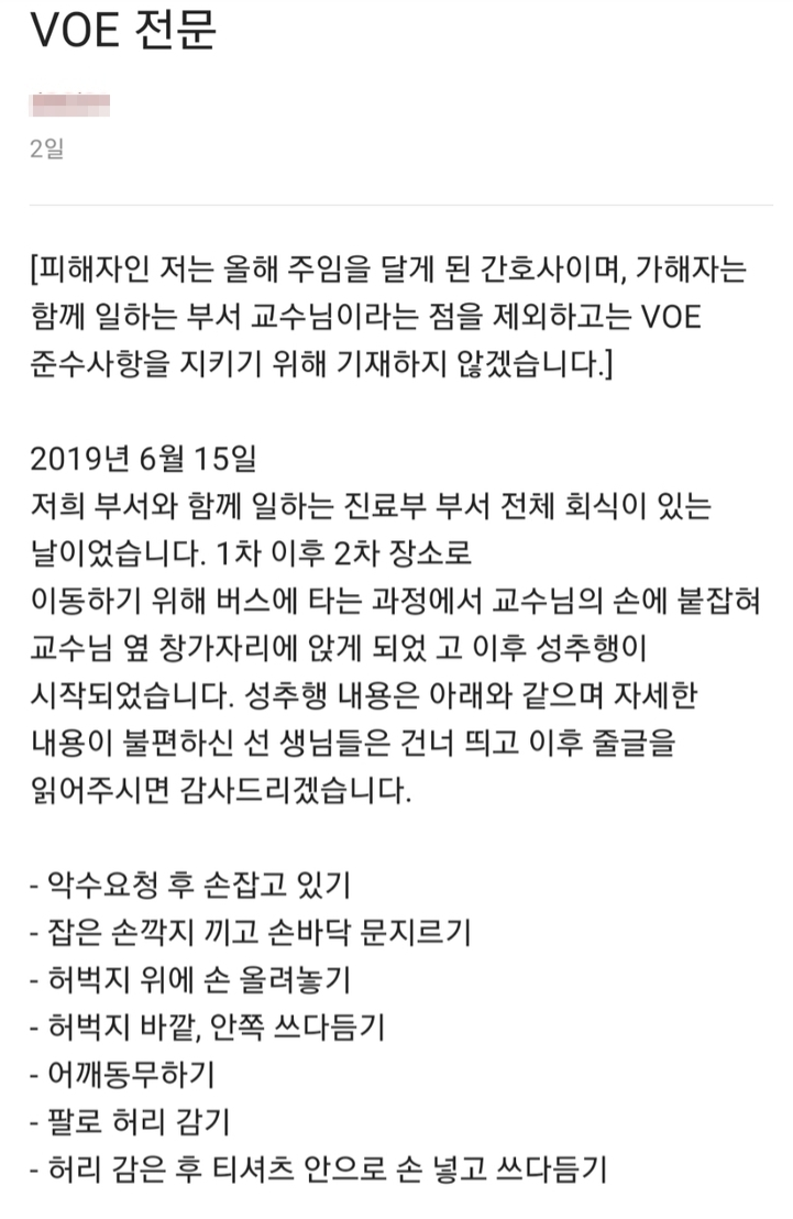 피해자들의 신고 내용에 따르면 이 교수는 나이 어린 간호사에게 '오빠'라고 불러보라고 하거나, 회의를 하는 도중에서 옆에 앉은 동료의 허벅지를 자주 쓰다듬거나, 의료진에게 심장 초음파를 보는 방법을 가르쳐주겠다면서 손으로 목 아래부터 가슴 아래까지 쓸어내리는 등 상습적인 성추행을 일삼았습니다.
