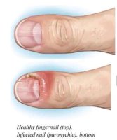 세균의 이차 감염에 의해 급성 조갑주위염으로 진행될 수도 있습니다. 당뇨병 환자처럼 감염에 대한 저항력이 떨어진 환자에게도 잘 발생합니다.